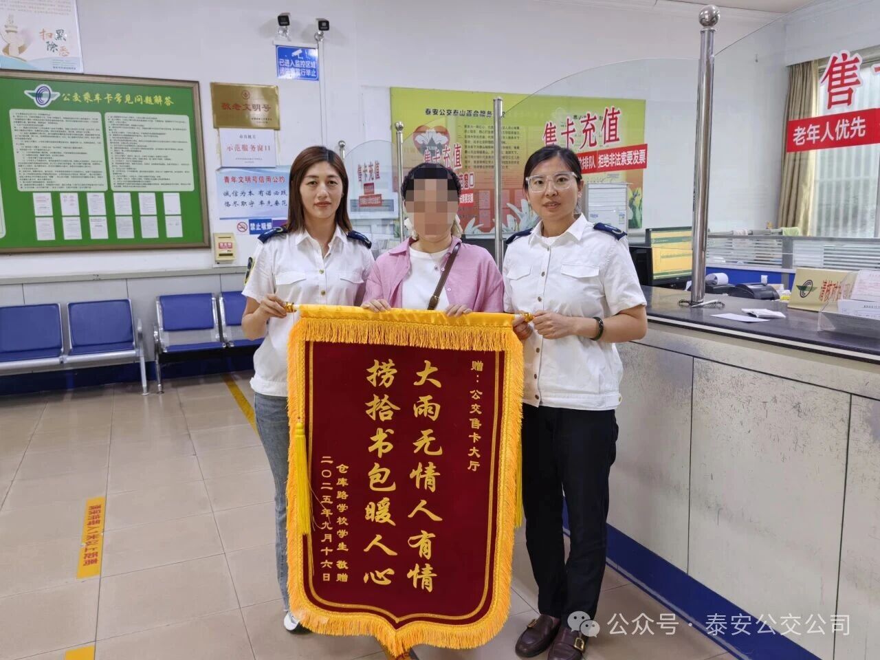 第二天下午,家長特意帶著一面錦旗來到泰山百合服務(wù)廳,贈予大廳工作人員,贊揚(yáng)她們“大雨無情人有情 撈拾書包暖人心”的暖心行為。面對家長的堅持,工作人員接過錦旗,心里涌起一陣溫暖——沒想到這小小的舉手之勞,能收獲家長如此真摯的肯定。