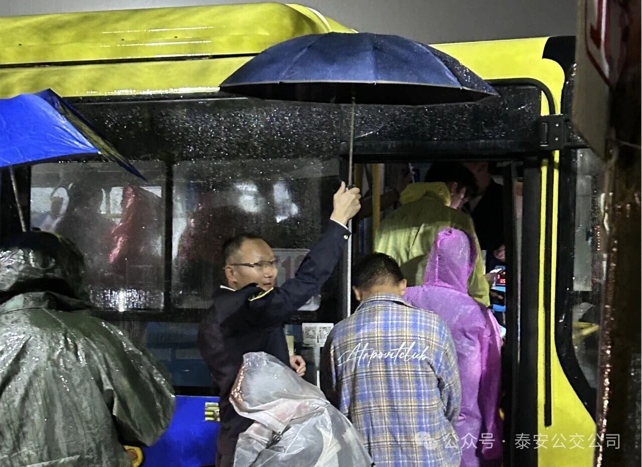 同樣是10月4日,夜幕比往常來(lái)得更早一些。傍晚時(shí)分,雨絲突然密集起來(lái),像珠簾般砸向地面,桃花峪公交樞紐站的路面很快積起淺淺的水洼。下山的游客們抱著行李、牽著孩子,站在站臺(tái)下有些慌亂,直到一個(gè)身著深藍(lán)色制服的身影撐著傘走了過來(lái)——他是泰安公交泰山百合志愿者,也是這個(gè)雨夜最溫暖的“守護(hù)者”。