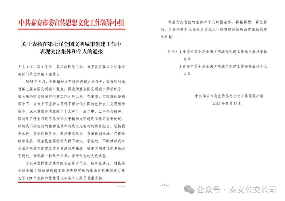 喜報(bào)!泰安公交獲評(píng)第七屆全國(guó)文明城市創(chuàng)建工作表現(xiàn)突出集體 2025-12-29 16:09:52 來(lái)源:信息審核