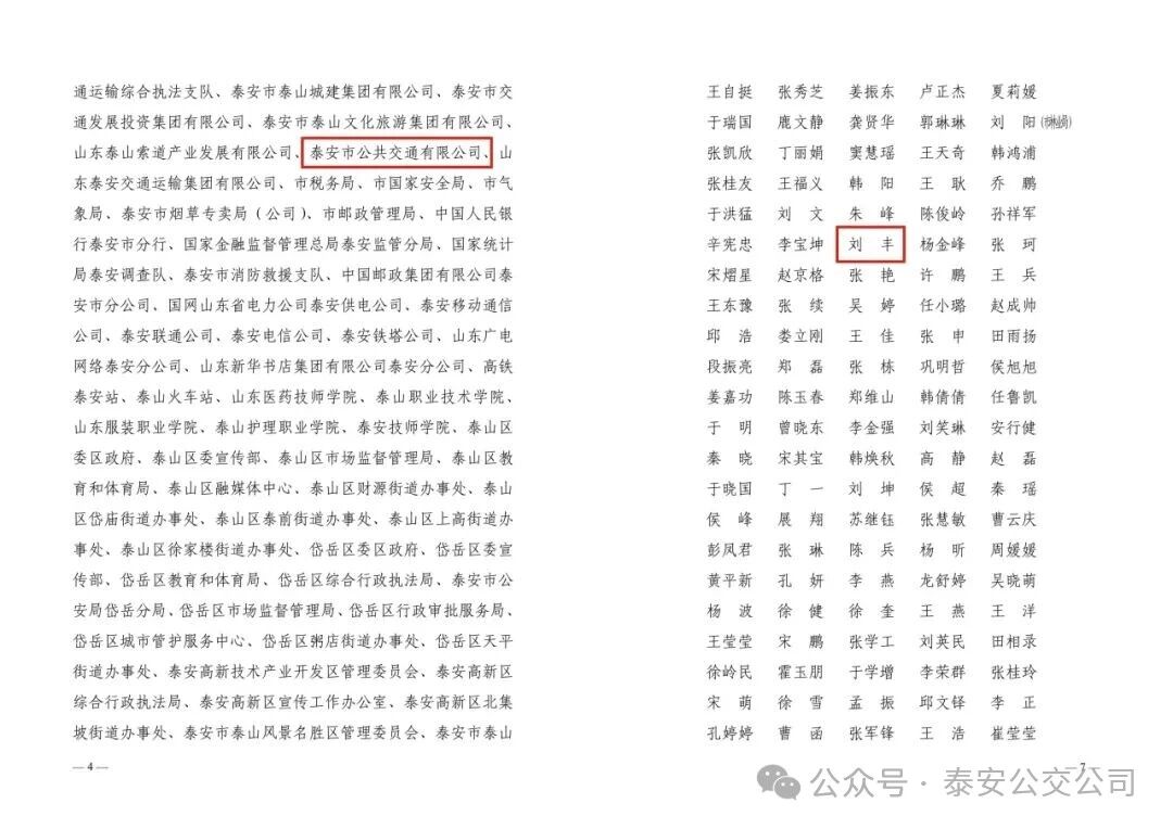 近日,中共泰安市委宣傳思想文化工作領(lǐng)導(dǎo)小組印發(fā)《關(guān)于表?yè)P(yáng)在第七屆全國(guó)文明城市創(chuàng)建工作中表現(xiàn)突出集體和個(gè)人的通報(bào)》,泰安市公共交通有限公司憑借在第七屆全國(guó)文明城市創(chuàng)建工作中的優(yōu)異表現(xiàn)和積極貢獻(xiàn),榮獲“第七屆全國(guó)文明城市創(chuàng)建工作表現(xiàn)突出集體”,黨群與人力資源部劉豐榮獲“第七屆全國(guó)文明城市創(chuàng)建工作表現(xiàn)突出個(gè)人”。